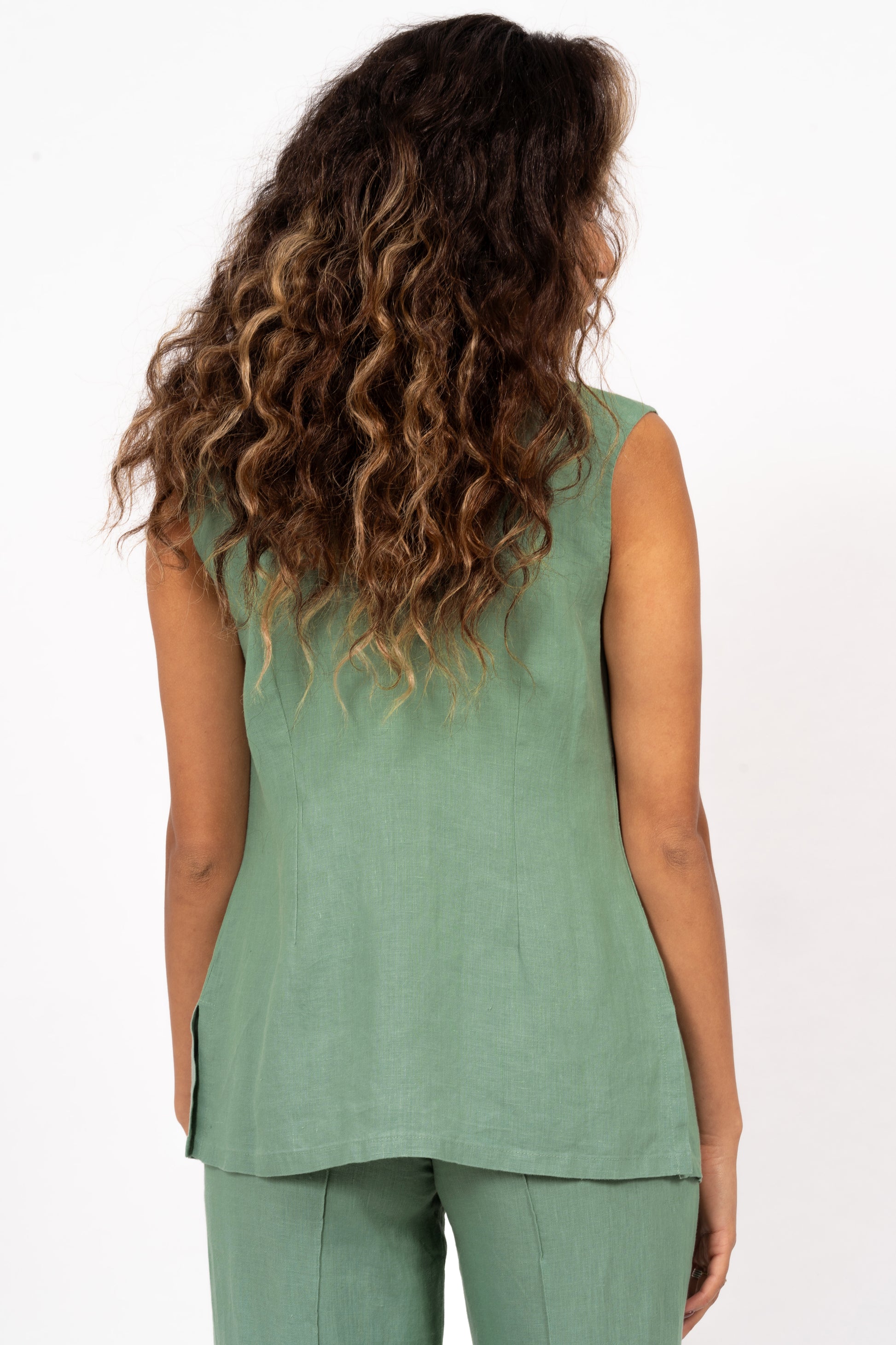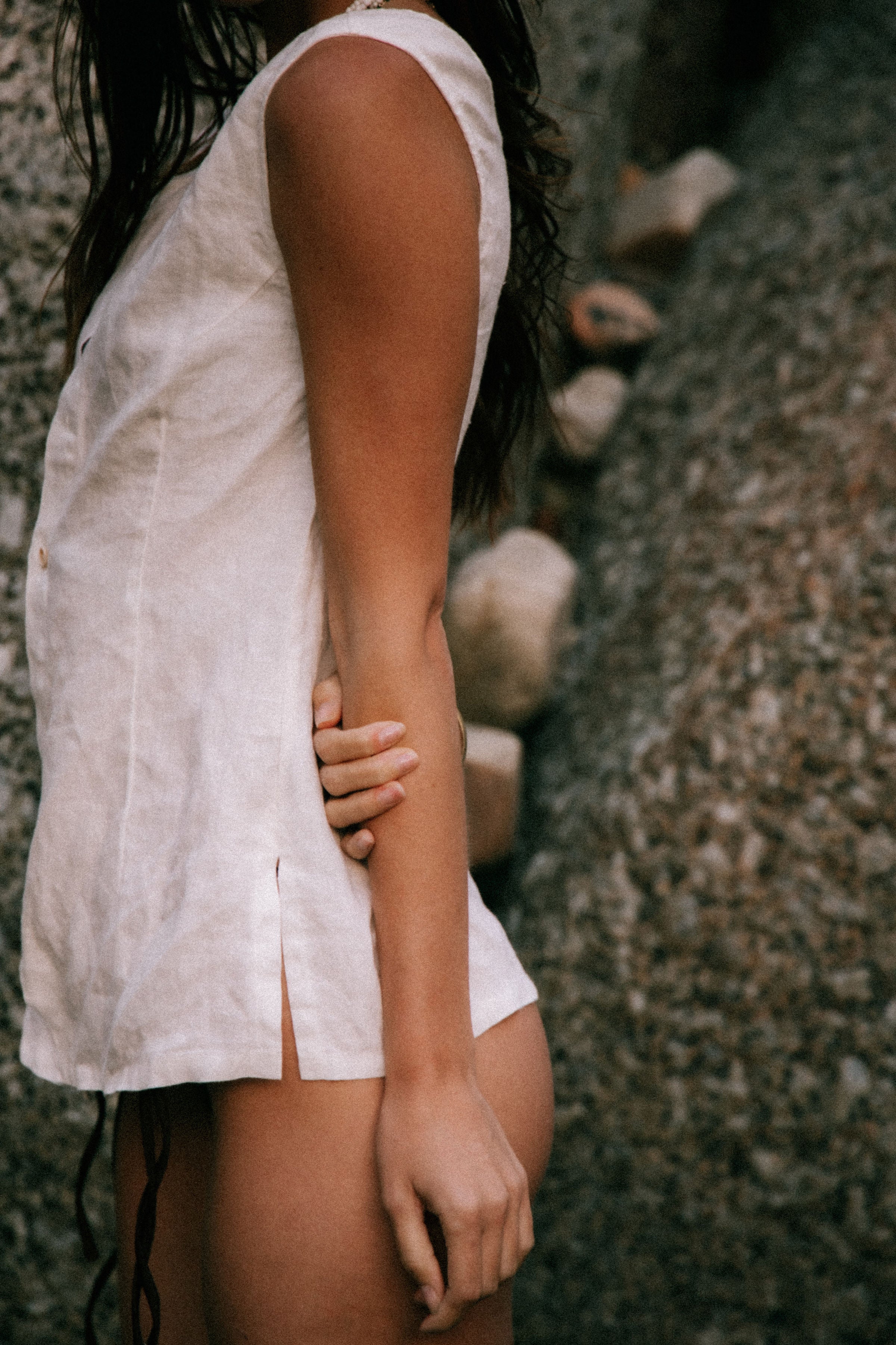 This sleeveless Julie top can be worn with one our matching bottoms or worn separately for a chic beach look. Wear it buttoned up or pair it with a bralette or bathing suit. Designed with a structured fit to enhance your shape, and with a dual V neck line. We used high quality, natural fibers, which makes for a breathable, yet sturdy style that lasts longer than other linen pieces. We recommend sizing up with larger chest size.